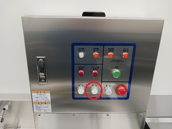 終了したら、バルブを閉じ、「洗浄」ボタンを押して停止し、洗浄ホッパーを元の位置に戻す。