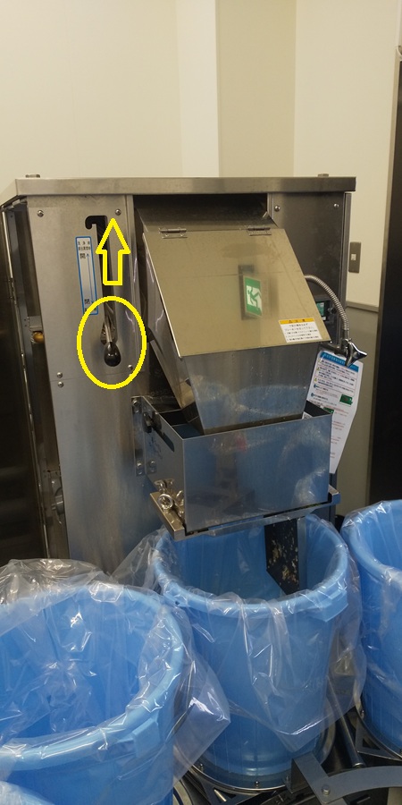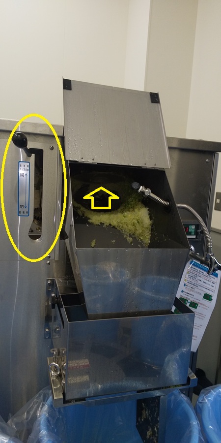 ④脱水機シュート部にある洗浄ホッパーを引き出し、制御盤の「洗浄」ボタンを押して脱水機洗浄筒部を回転させる。脱水機付属のバルブを開き、圧縮フタ部に水をかけながらスクリュー部・シュート部に付着した生ごみを洗い流す。