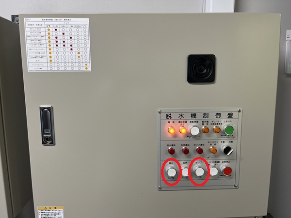 脱水機制御盤「脱水」・「ポンプ」ボタン